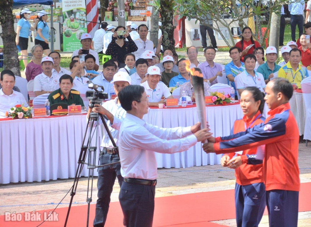 Đồng chí Nguyễn Đình Trung, Bí thư Tỉnh ủy tiếp lửa, đốt ngọn đuốc truyền thống Hội thao.